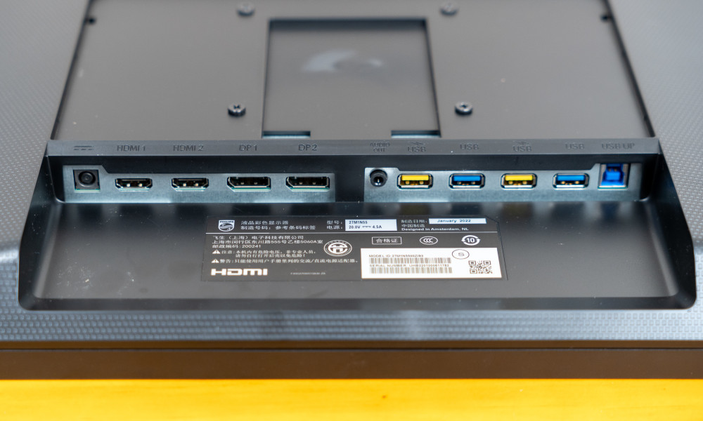 除了可以直接调整在不同角度的支架之外,与Philips 27M1N5500Z一样,它也为用户提供标准100*100mm标准VESA架安装孔。你可以根据你的需要选择自己的支持。但我要说,原型牛角底框的细节和功能是同价格范围内的首等体验,足够满足用户日常的个人设置需要。