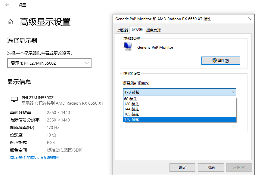 如果你使用Windows,通过右击桌面显示设置,可以找到高级显示设置。在高级显示设置中,选择 Display Adapter Properties for Display 1,选择显示器,查看屏幕刷新频率设置,你可以看到菲利普斯27M1N5500Z的60Hz、120Hz、144Hz、165Hz和170Hz选项。