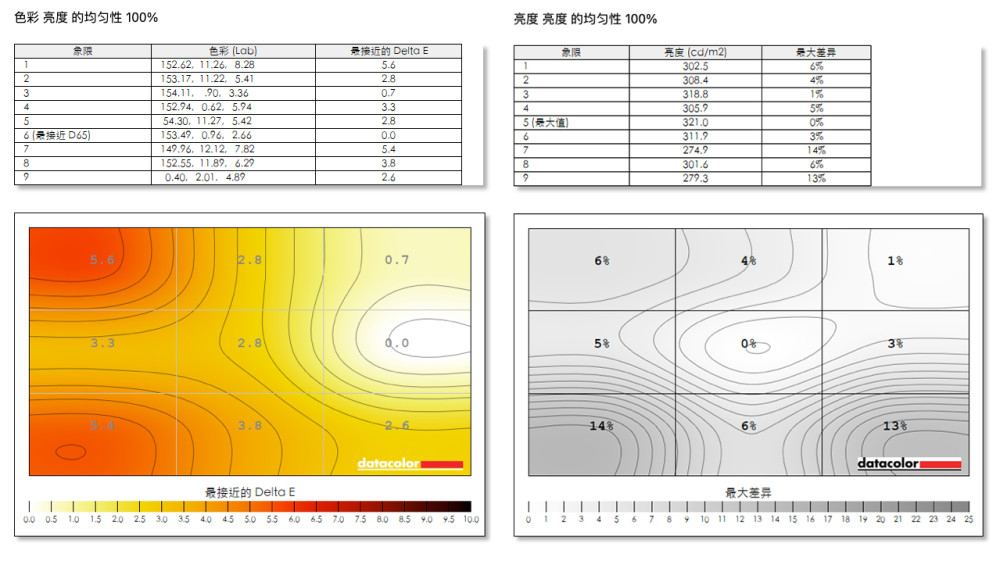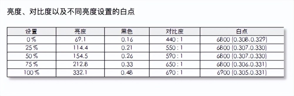 在亮度方面,在用户模式测试中,最大亮度为332d/m,最低亮度为69.1d/m,对比度为690:1,白色点为6900K。
