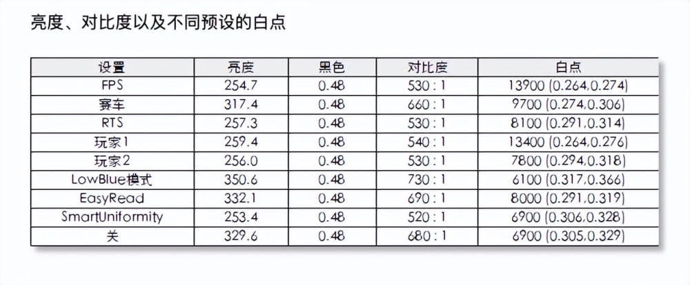 从不同亮度、对比度和不同预定的白点测试中可以看出,在显示不同OSD模式时,SmartUnigormity模式的最低亮度为253,而LowBlue模式下的最大亮度为350.6.