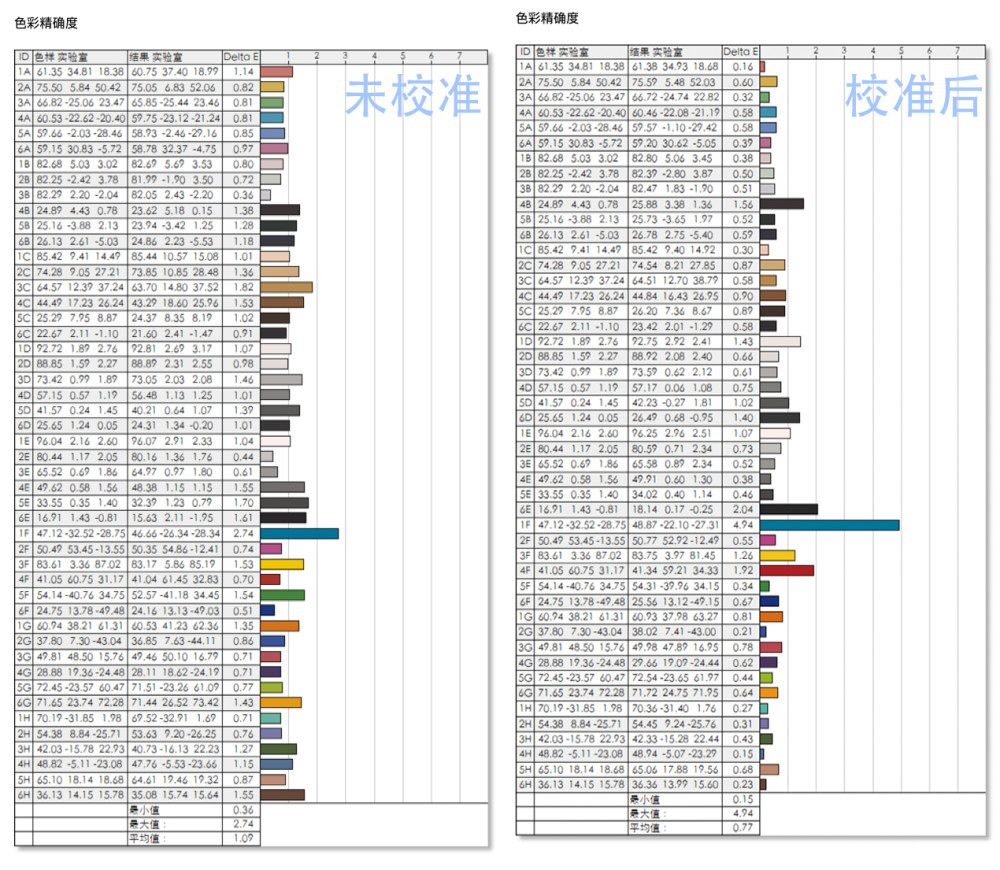 最后,关于颜色的准确性,没有校正,测试最多2种颜色。最小 0.36,ΔE的平均值是1.09,总的颜色比还是好,它对于需要颜色和电力的用户来说是一个很好的选择。在学校的颜色之后,我们可以看到到4.94的颜色差异,最小 0.15,ΔE的平均值是0.77,
