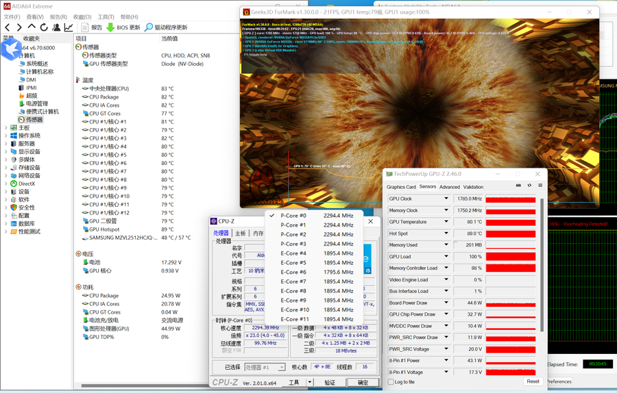 AIDA64 FPU+FurMark双烤30分钟,MagicBook 14在CPU25W+GPU45W上稳定,它几乎完全释放了MX550的性能潜力。而且,在这样的表现下,魔术书14的核心温度还没有达到90度的限度,相反,它保持在摄氏80度左右,实际的热 dissipation 能力非常强.