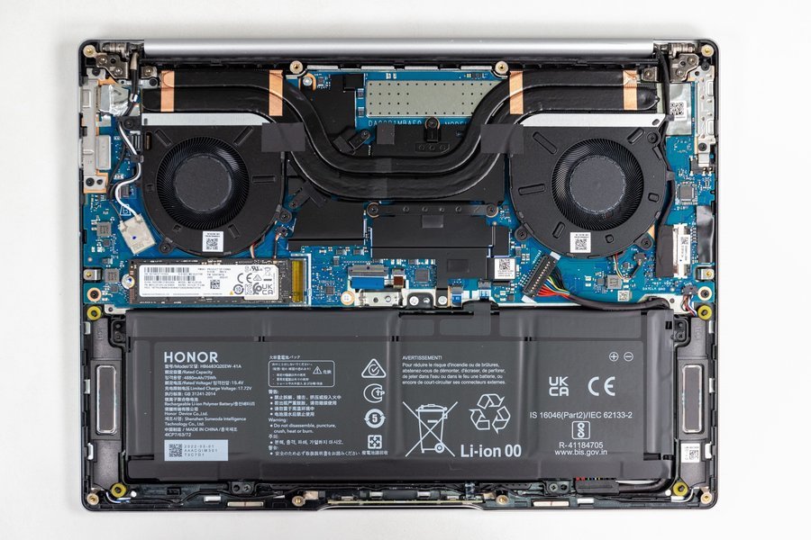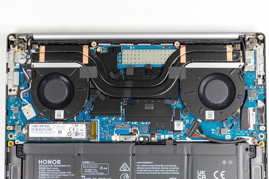 内部的拆解使它的性能似乎被压倒了.新 Glorious MagicBook 14 的加热规格大幅升级 - 几乎所有的板板都由加热模块覆盖,6mm+8mm高profile双热管通过CPU和GPU,同时,显示 、 供电 、 南桥等供暖部件均由大面积的单一供暖板总数覆盖.连接左和右热管,通过双扇吹出机器的热量。