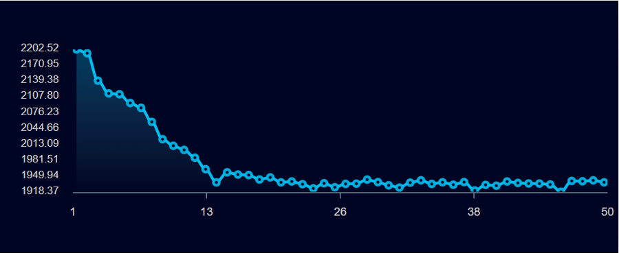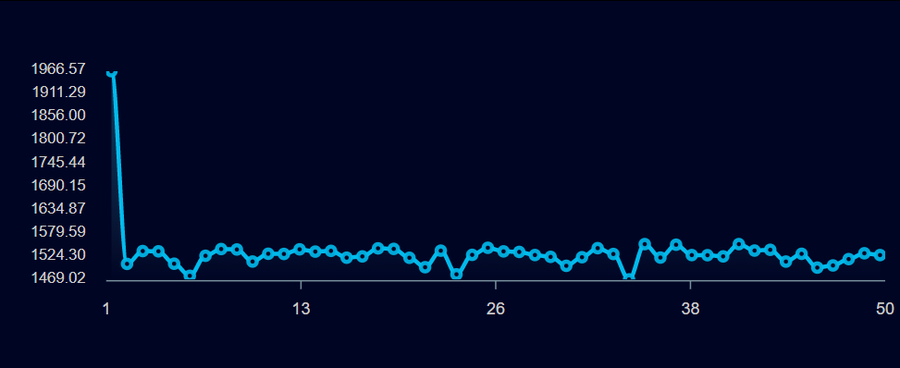首先,在Glorious MagicBook 14上,使用KineBench R15进行了50圈运行测试。数据显示,在第一轮测试中,MagicBook14可以达到2,200cb,这些数据可以反映CPU在短期高负荷下的工作性能;随后,CPU可以在1900cb以上稳定,几乎呈一条直线,可以说,MagicBook 14的CPU性能稳定于长时间的负载。