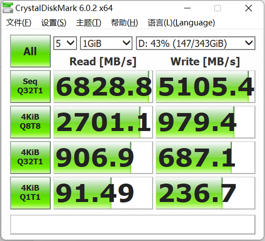 硬盘是512GB三星PM9A1,PCIE 4.High-end型号在0的硬盘上,具有分别6828MB/s和5102MB/s的实时连续读写速度,以及分别91MB/s和236MB/s的4K随机读写速度,性能优异。