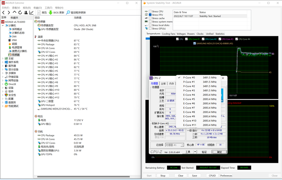 在室温26°C下,使用AIDA64单烤10分钟FPU,CPU核心温度87°C,功率消耗稳定50W,P核心频率3.5GHz,E核频率2.7GHz,性能释放无疑在相同的大小下是最高标准。