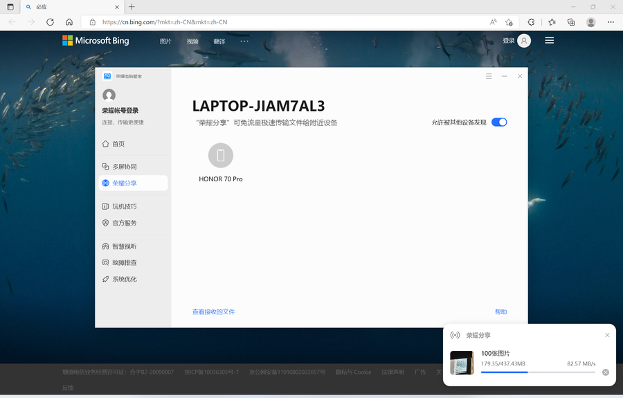 光荣共享是实现个人电脑、移动电话、平板设备的流动快速传输,最多可同时传输100个文件/图像,实时速度超过80MB/s,400MB照片在几秒内传送出来,并且可以共享和传输,而不干扰后端的正常下载和浏览任务在互联网上。