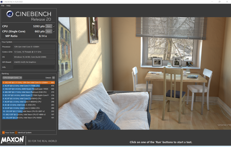 在KineBench R20的测试中,单核663分,多核5393分,以及C4D渲染性能非常出色。