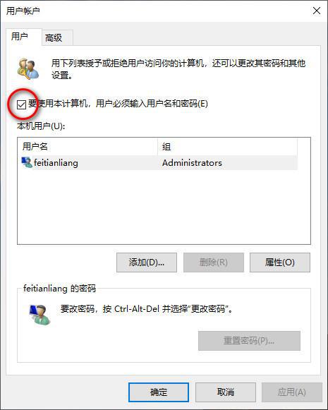 这将打开Windows系统用户帐户管理接口。在默认情况下,这里有一个叫做"使用这台电脑,用户必须输入用户名和密码"选项,它处于选中的状态。这意味着每天当你打开电脑时,你必须输入密码才能打开它。