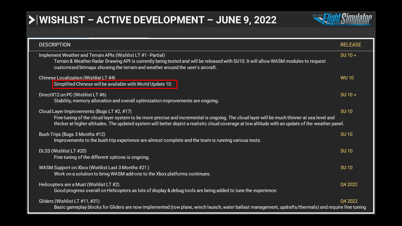 2009年6月11日,Microsoft Flight Simulation网站宣布游戏将在“World Update 10”中以中文发布,并计划推出DirectX12(PC)和DLSS等额外功能。