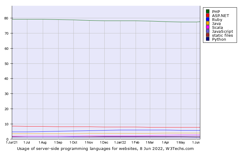 然而,W3Techs的数据表明,尽管PHP的市场占有率在这些编程语言的崛起后有所下降,但它仍然是排名最高的Web开发者。