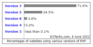 为此,W3Techs也统计了使用不同版本的PHP的网站的份额:尽管PHP开发者在2020年发布了PHP 8,但使用不同版本的PHP的网站的数量一直在稳步增长。但作为最新主版本,它的使用率远低于 PHP 7(71).6%和 PHP 5 (24.5%),只有百分之六的网站使用PHP8。