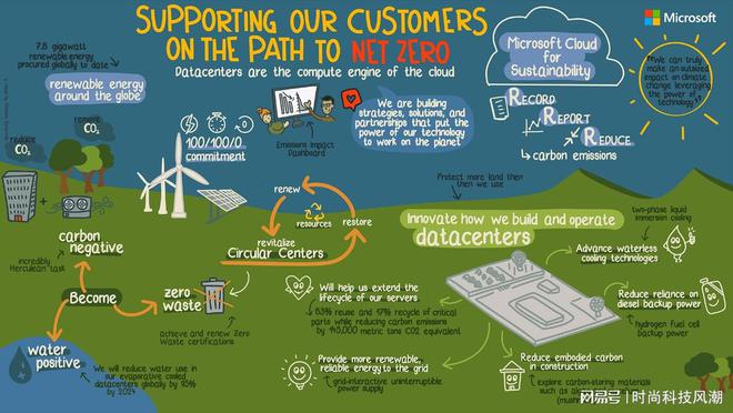 使用可再生能源:微软承诺2025年,全世界数据中心、建筑物和公园的全部能源消耗,可再生能源100%到零碳排放。鉴于 在 某些 地区, 无法 直接 购买 绿色 能源 供电,微软也购买了国际认可的零碳电力证书。整体计算下来,微软将拥有95%以上的能源消耗来自可再生能源。