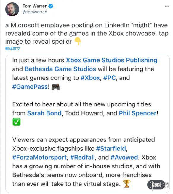 外媒The Verge 高级编辑Tom Warren发现微软的一位员工在领英上透露了一些明日凌晨1点 Xbox & B社 发布会上将展示的独家旗舰级游戏。