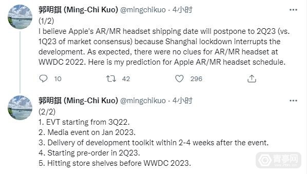 天津国际分析师郭明泽说,由于 研究 和 开发 的 进展 中断,预计苹果的AR/MR头灯将在2022年第三季度开始施工验证;媒体宣传活动将在2023年1月展开;发展工具包在活动后2至4周内交付;预售于2023年第二季度开始,WWDC於2023年開始運作。