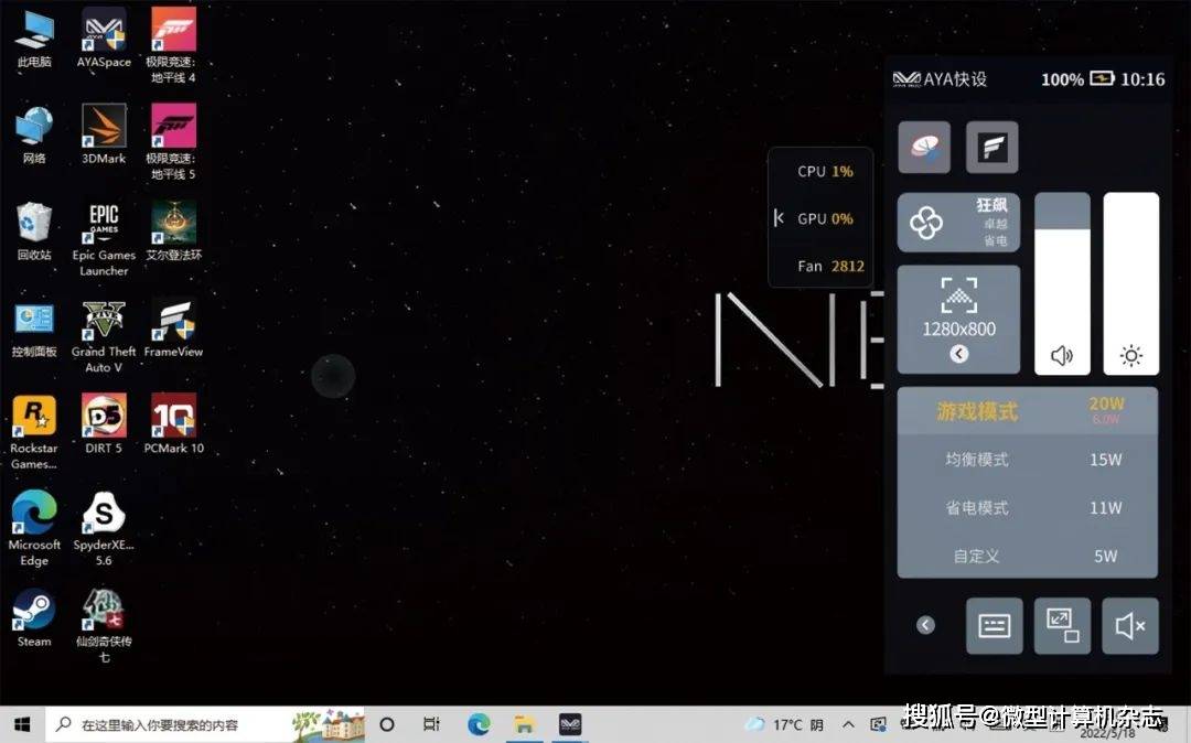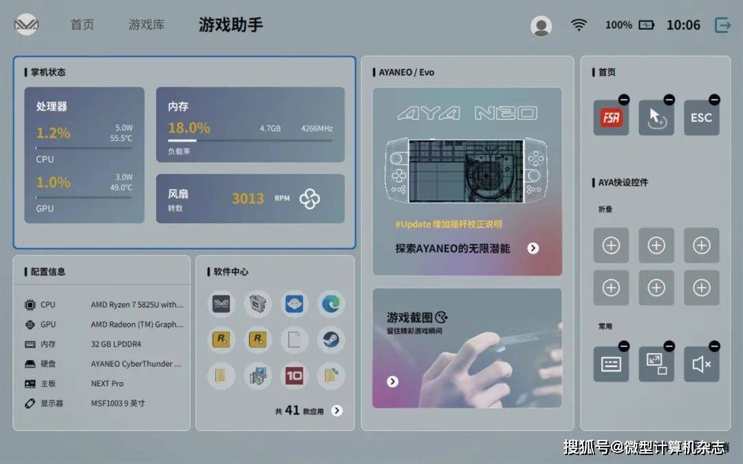 作为基于Windows的游戏机,AYANEO NEXT Pro除了硬件需要考虑用户体验,还需要打破软件界面中传统的窗口交互设计。于是,AYA空间管理软件诞生。与早期AYA空间软件相比,现在它的功能更加强大,相互作用也有许多缺点。它甚至通过升级它使摇滚器可以作为鼠标使用。你只需要拨一下左键,就能移动鼠标箭头,双击文件两次,再打开它。同时,右下角大圆的KB按钮,快速调用AYA快速设置窗口,通过这个小窗口可以调用模式,调整分辨率、亮度和音量,还可以查看当前的处理器, GPU使用率和风扇速度信息。如果长按KB键,您可以直接访问AYA空间管理软件,非常方便。