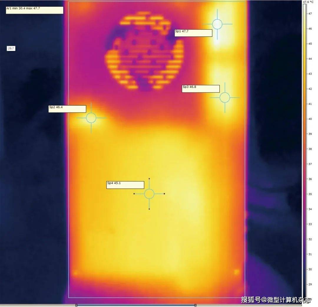 掌机与游戏本不同,由于机身更小,内部空间会相当紧凑,测试身体的热 dissipation设计.AYANEO NEXT Pro有后部设计的入口,顶部是它出风口。在28°C的室内温度下,玩了半个小时后,采用热成像仪测定该机的平均温度为41°C.最高温度为47.7°C,最高温度区域位于出口处,手里没有热的手感.同时,我注意到,当机器处于高负荷状态时,它的风扇速度在高速之间保持,你可以听到明显的风扇噪音。