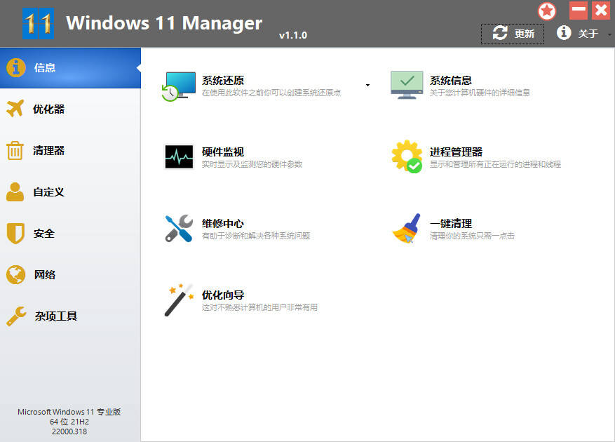 Windows 11管理器是一个集成的系统优化软件,提供超过40种实用工具以优化,调整,清理,加快和修复Windows11,它能使系统运行得更快,消除系统故障,提高稳定性和安全,个人化Windows11,满足您对系统优化调整的期望.