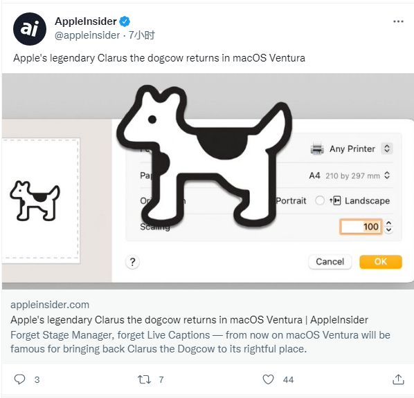 」 「Clarus the dogcow returns to MacOS 13 Ventura」。