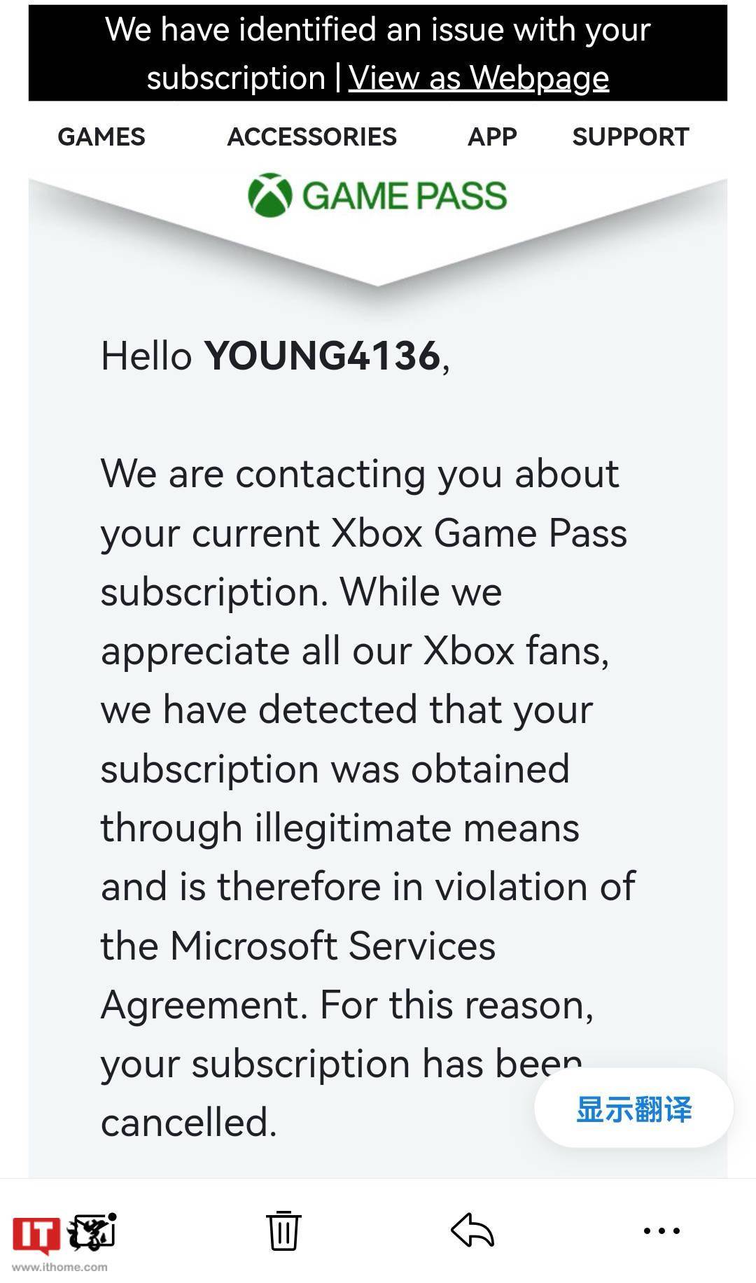 微软的电子邮件通知通知您,有关您当前的Xbox Game Pass订阅,您被发现非法获取您的订阅,因此违反了微软服务协议。为此,您的订阅已被取消。