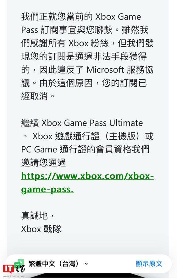 IT之家此前报道,微软电子邮件通知,我们与贵方有关贵方目前的Xbox Game Pass订阅,如果你发现你的订阅是非法的,因此,它违反了微软服务协议,由于该原因,你的订阅已经取消。