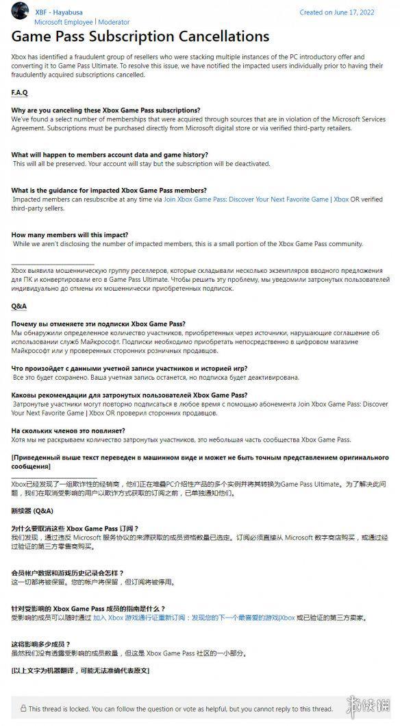 昨天有很多Xbox玩家的反应,《Xbox Game Pass》订阅已被强迫撤销。同时,我收到了两个来自微软的通知。邮件显示,购买的XGP会员是通过非法手段获得的,违反微软服务协议,因此订阅被取消。同时, 还 发给 签证 卡 的 相应 退款 。昨天,微软的官员还使用汉语、俄语和英语对Xbox社区的问题作出了回应。
