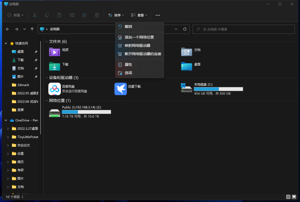 回到到多人工作流,这实际上只涉及一个关键点: 远程安装网络磁盘.在Win11系统中,打开任务管理器,按右上角的三个小点,单击地图网络驱动器,输入地址和密码,你可以使用微软专有的SMB协议,在计算机中固定网络位置,这就像打开本地磁盘一样,打开网络存储器。办公室所有的电脑都按上述操作,每个人都可以一起参观、阅读和写这块大硬盘。