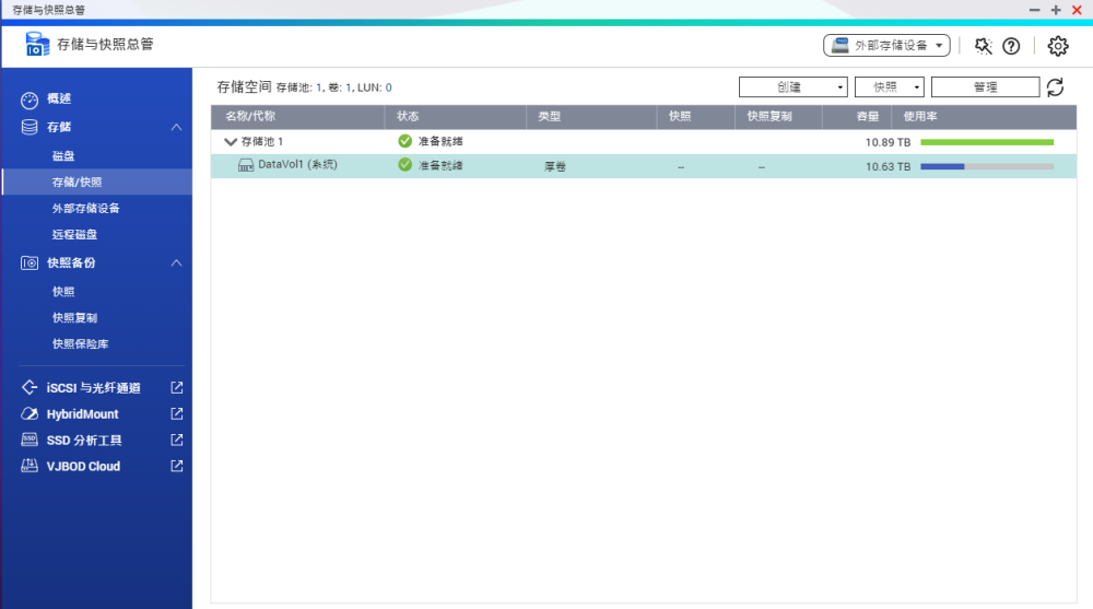 我们选择在RAID5阵列中建立一个存储池,RAID5可以处理最大一个硬盘损坏,而不丢失数据,并提供更高的读取速度。 4T磁盘的RAID5阵列后,存储池的容量达到11T。