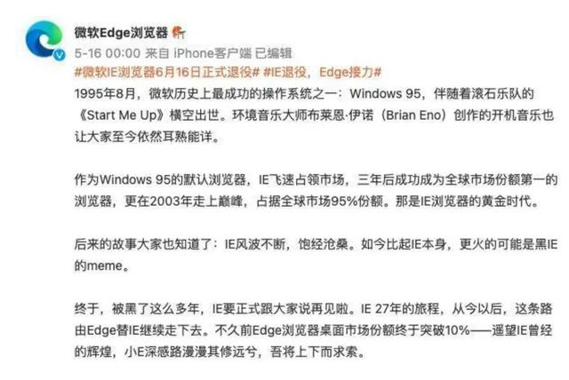 2022年5月16日,在IE浏览器永久关闭后,边缘浏览器发布了这个微博客,虽然有一些“自卑”和嘲笑的语调,但它是真正的微软官员。这个微博客的问题也正式宣布了IE时代的结束,在许多人难以接受的时候,” “我的青春已经结束。