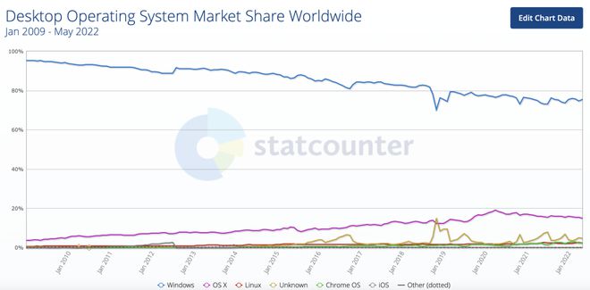 众所周知,在桌面操作系统市场上,窗子里到处都是尘埃,是无可匹敌的存在。尽管最近对macOS和开放源代码操作系统进行了攻击,Windows的市场占有率在竞争中稳步下降,但根据cnews.ru统计,截至2022年5月,Windows仍占全球市场的75%。