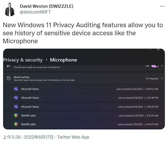 戴维·韦斯顿最近在Twitter上发表的 Tweets 和引用是众所周知的,在Windows11中新引入的“私隐审计”功能,方便地查看哪些应用程序已经访问用户设备。
