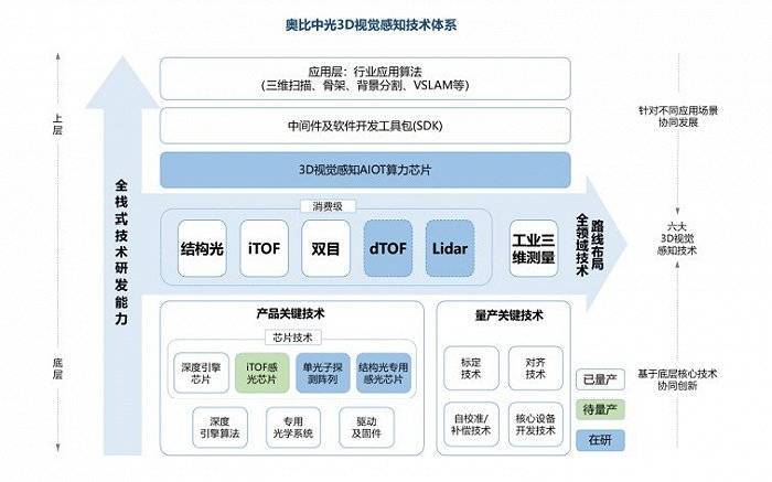 3D视觉感知是为人工智能提供3D视觉能力的关键基本连贯技术。经过9年发展,Obi-Chong光已成长为国内军事企业,具有3D视觉感知,全盘布局结构光学 、 iToF 、 双眼 、 dToF 、 Lidar 、 工业三维测量六大技术,专利申请数目接近1200件,比肩全球一流企业。
