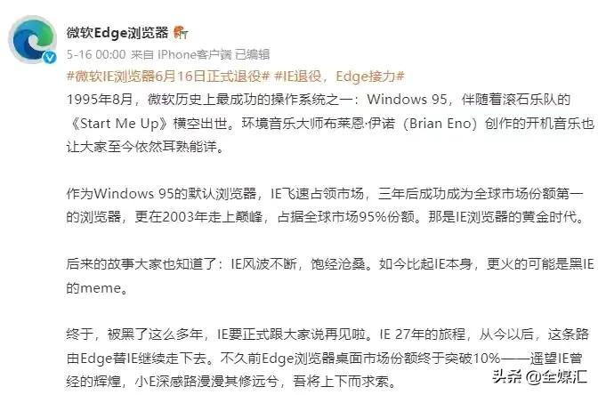 此前,在5月16日,微软的Edge浏览器在其官方博客网站上宣布,微软的IE浏览器将于6月16日正式退役,其功能将与Edge浏览器相连。