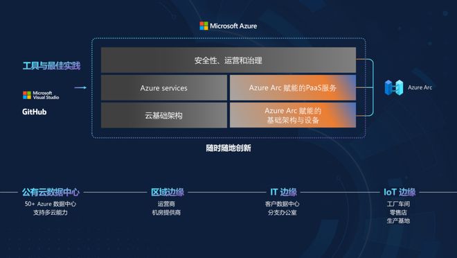在最初的混合云概念中,微软使用公共和私人云来共享数据和应用程序,创造一个一致的用户体验。 现在,混合云的概念逐渐扩展到更多场景,如边缘边缘、多云,微软还创新并实现了架构和操作系统完全统一。