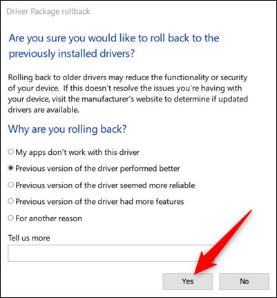 Windows会发出警告并问你为什么想回到以前的驱动程序。 单击响应,然后单击“是”。