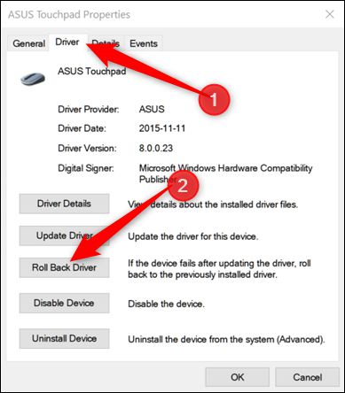单击窗口顶部的“驱动程序”选项卡,然后单击“返回驱动程序”。