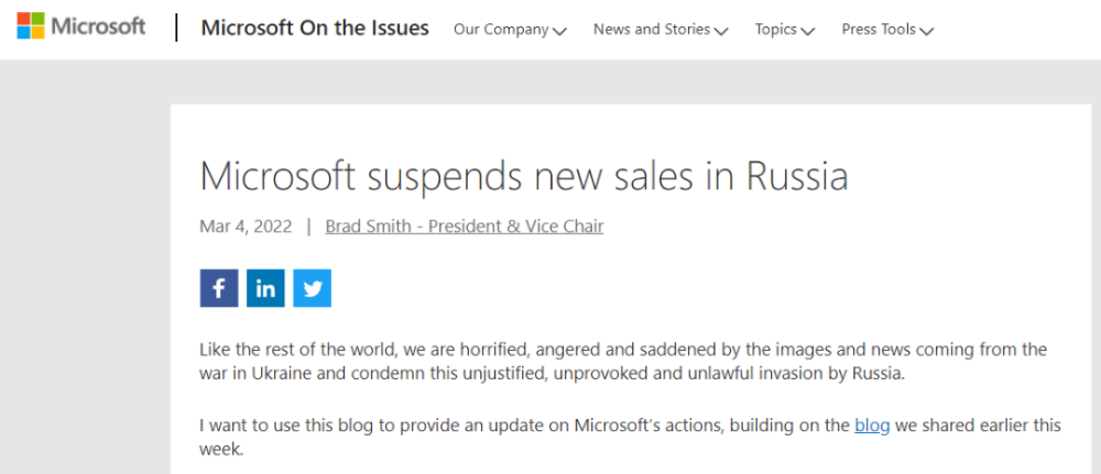 3月4日,微软总裁和首席法官布拉德·史密斯在博客平台上宣布,他将暂停俄罗斯所有新产品和服务的销售,以遵守政府制裁决定。