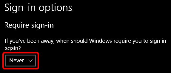 必须关闭最后一个选项,以确保您永远不必使用密码再次登录。在“设置”应用程序中,转到“设置”>“帐户”>“登录选项”,然后在“需要登录”下从下拉列表中选择“从不”。
