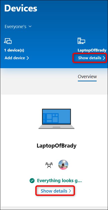 在主页上, 单击“显示详细信息”链接在您想锁定的设备下.