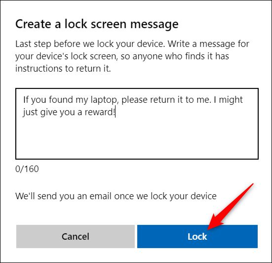 在下一个屏幕上,您可以设置自定义消息来帮助人们返回您的设备。 当有人打开设备时,消息出现在设备锁屏上。