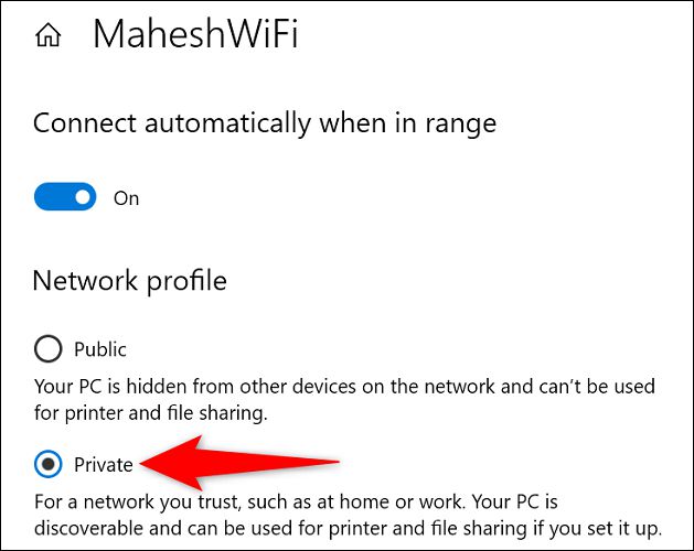 另一方面,如果您选择一个私人配置文件,Windows允许您在网络上找到您的PC。 当使用这个配置文件时,您也可以使用文件和打印机共享。