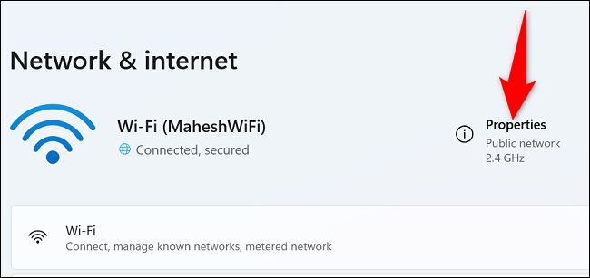 您将看到“网络和互联网”页,在此,选择“属性”在网络名称顶部。