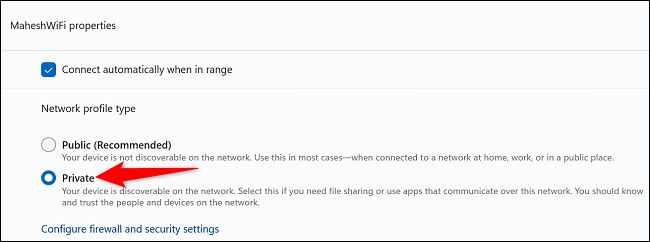 在Wi-Fi页面上,从网络配置文件类型选项中选择私有。