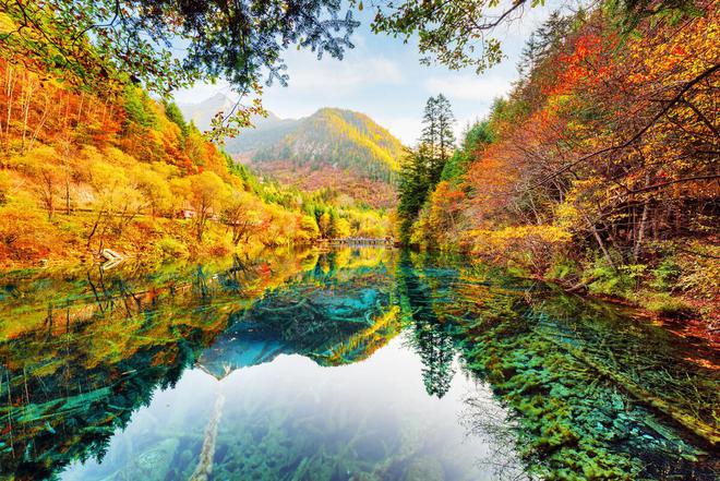 九寨沟以九个藏族村庄闻名,被列入教科文组织世界遗产。