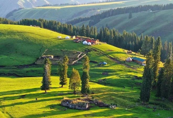 这里,你可以看到蓝色的天空、白云、银雪山、墨绿色的杉林、浅蓝色的草原和多彩的鲜花海。