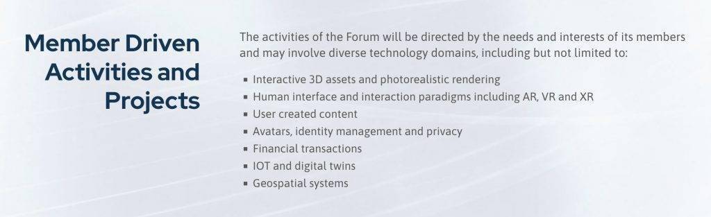 根据论坛的介绍,论坛 将 集中 讨论 某些 项目 的 执行,例如,黑客马拉松、插件节点和开放源代码工具,测试和采纳加速标准,同时制定一致的术语和部署准则。论坛的节目重点包括,但不限于,交互的3D资产,金融交易,和机器接口程序,如AR和VR。