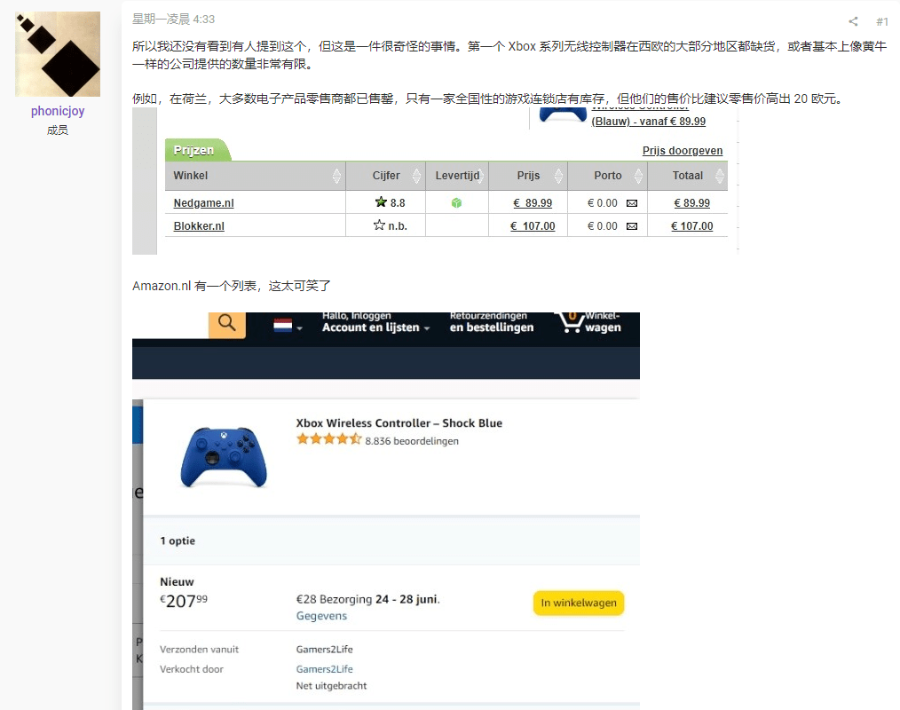 此外,根据6月20日的在线resetera论坛上的玩家报告,包括法国、荷兰、德国、他们都面临着同样的问题:微软官方商店和当地零售商没有Xbox手柄的库存,而亚马逊的第三方价格已经推高到了可笑的水平。