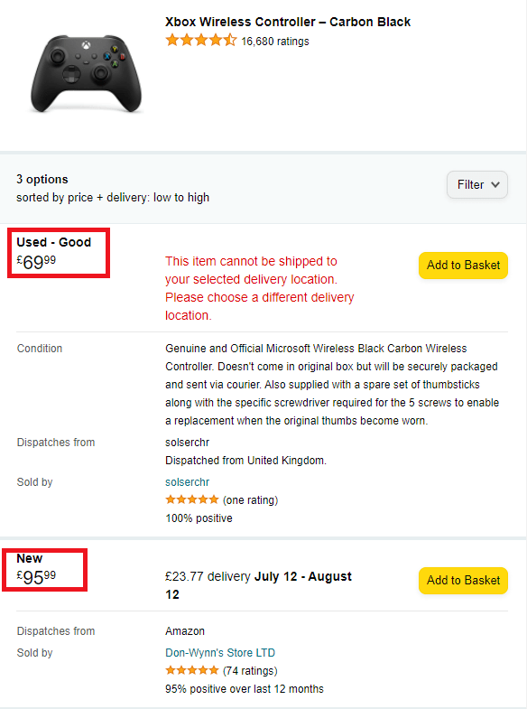 只有英国的亚马逊公司正在销售第三方标准碳黑手柄。至本文截稿前,只有三个碳黑手柄在现场。其中一部是二手货,价格为69.99英镑(约576元人民币),它比一小 handful 的某些有限版手柄贵得多.至于全新手柄,价格将为95.99英镑(约790元)。官方价格很快达到54.99倍。