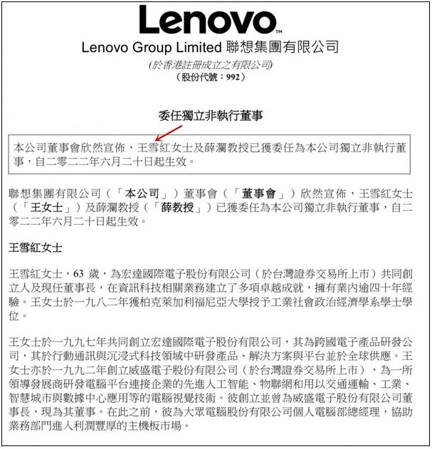 6月21日6月20日晚上,香港财政部发出公告,任命王女士和谢伦教授为联想集团独立的非执行董事,自2022年6月20日起生效。