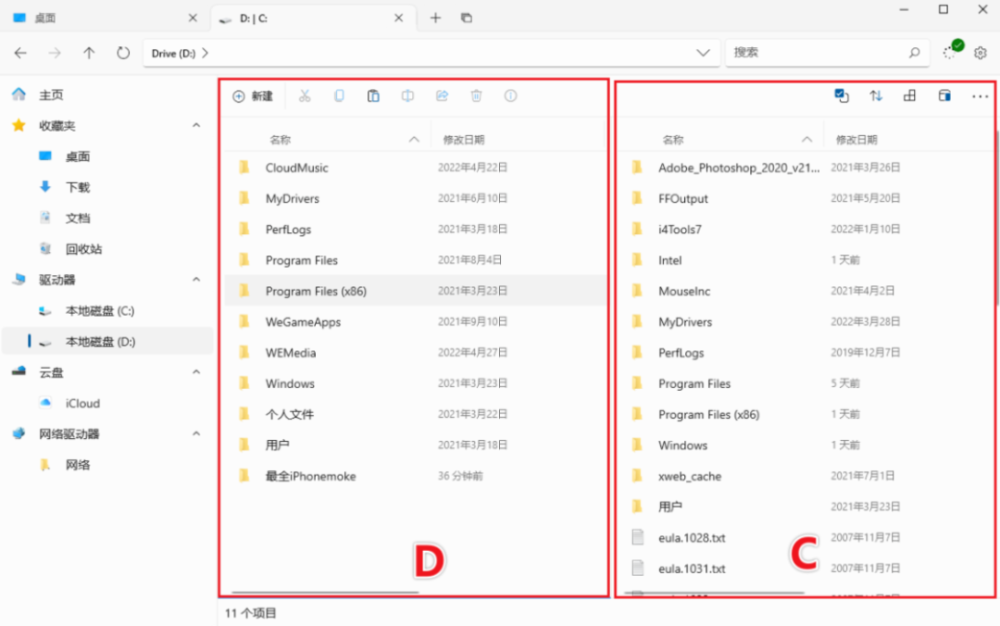 您可以同时打开D磁盘和C磁盘在一个标签页,这使得比较和移动文件既方便又直观。